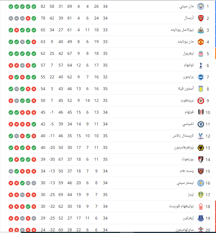 جدول ترتيب الدوري الانجليزي ..ويحتل ليفربول المركز الخامس من جدول ترتيب الدوري الانجليزي للموسم الجاري برصيد 62 نقطة، فيما يتنازع فريق مانشستر سيتي متصدر الدوري الانجليزي برصيد 82 مع فريق ارسنال الوصيف برصيد 78 نقطة، وجاء جدول ترتيب الدوري الانجليزي كالاتي: