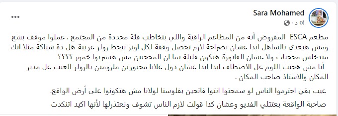 وقالت صاحبة الواقعة فى فيديو لها " المكان اسمه أسكا مطعم ESCA.. وحاجزين أنا وصحابي 15 فرد علشان عيد ميلادي ورفضوا دخولنا علشان صديقتنا محجبة والمفروض انه مكان راقي بس أثبت إنه مكان زبالة ومش منوهين غنه فى دريس كود أو ملابس ممنوعة ".