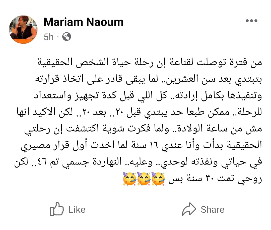 وكتبت“مريم نعوم ” عبر حسابها الرسمي على موقع التواصل الاجتماعي “الفيسبوك” احتفالا بعد ميلادها:" من فترة توصلت لقناعة إن رحلة حياة الشخص الحقيقية بتبتدي بعد سن العشرين، لما يبقى قادر على اتخاذ قرارته وتنفيذها بكامل إرادته، كل اللي قبل كدة تجهيز واستعداد للرحلة".