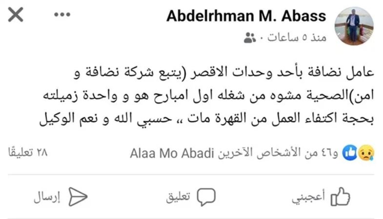 وحسب ما نشر علي مواقع التواصل الاجتماعي “فيسبوك” بأنه كان يعمل عامل نظافة بأحد وحدات الصحية بالأقصر، التابعة لشركة نظافة وأمن “الصحيه فصله من العمل أول امبارح هو وزميلة أخرى بحجة اكتفاء العمل وحين علمه بذلك مات قهرا “حسبي الله ونعم الوكيل”.