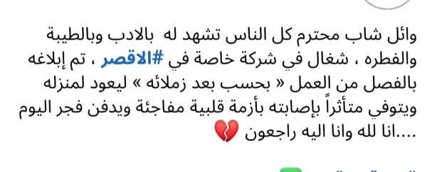 وقال أحد رواد السوشيال الميديا في منشور له علي منصات التواصل الاجتماعي" فيسبوك": وائل شاب محترم يشهد له الجميع بالأدب والطيبة، والفطرة شغال في شركة في الأقصر، حيث تم إبلاغه بالفصل عن العمل “بحسب بعد زملائه ”ليعود لمنزله وتوفي متأثرا بإصابته بأزمة قلبية مفاجئه و يدفن فجر اليوم .