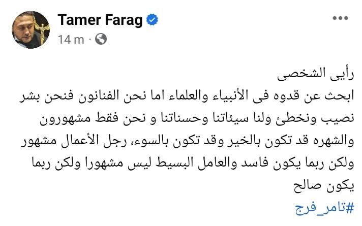 وكتب تامر فرج: "في رأيي الشخصي، أبحث عن قدوة في الأنبياء والعلماء، أما نحن الفنانون فنحن بشر نُصيب ونخطئ، ولنا سيئاتنا وحسناتنا.