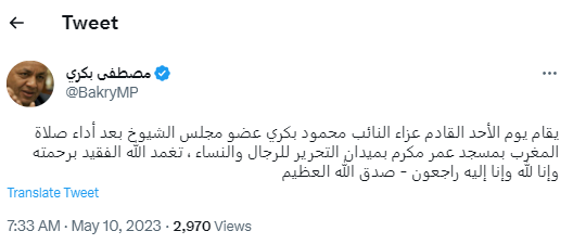 وكتب مصطفى بكرى على تويتر ناعيا شقيقه: "يقام يوم الأحد القادم عزاء النائب محمود بكري عضو مجلس الشيوخ بعد أداء صلاة المغرب بمسجد عمر مكرم بميدان التحرير للرجال والنساء ، تغمد الله الفقيد برحمته وإنا لله وإنا إليه راجعون - صدق الله العظيم".