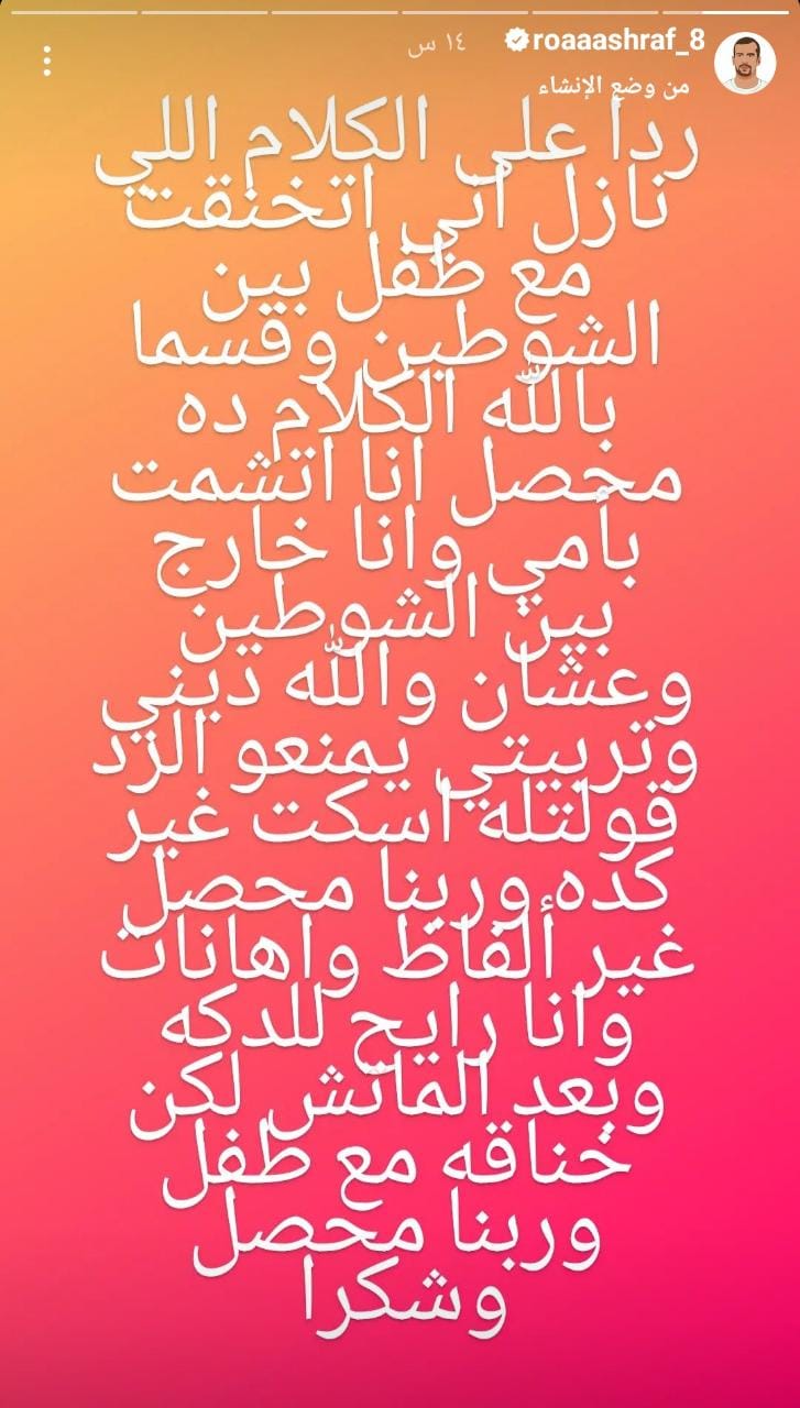 وقال روقا عبر حسابه الرسمي بموقع التواصل الاجتماعي "انستجرام": "توضيح للجميع، أنا لم أدخل في شجار مع أحد مشجعي الزمالك، أنا تعرضت للسب من قبل المشجع".