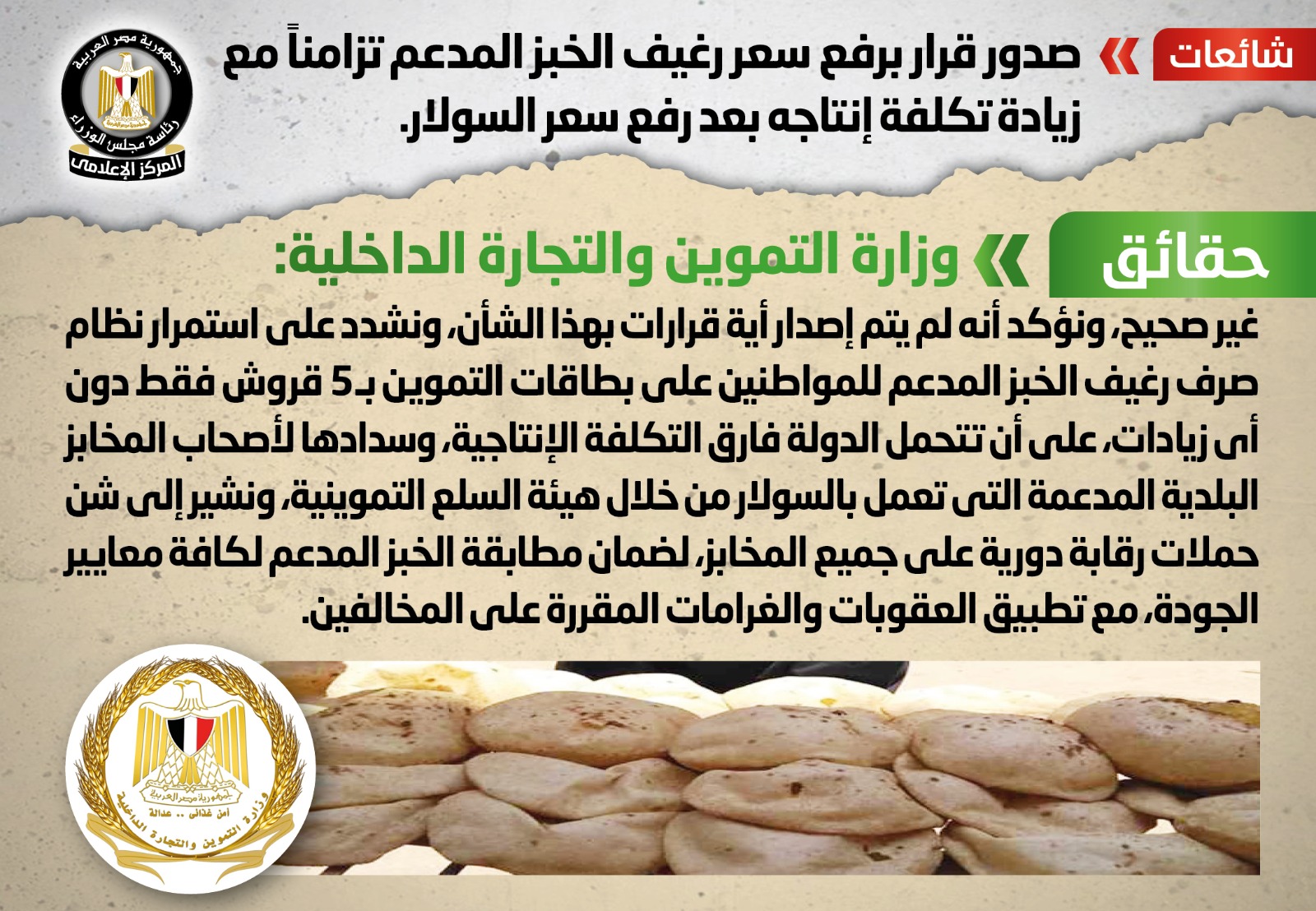 قام المركز الإعلامي لمجلس الوزراء بالتواصل مع وزارة التموين والتجارة الداخلية، والتي نفت تلك الأنباء، مُؤكدةً أنه لا صحة لرفع سعر رغيف الخبز المدعم تزامناً مع زيادة تكلفة إنتاجه بعد رفع سعر السولار، وأنه لم يتم إصدار أية قرارات بهذا الشأن، مُشددةً على استمرار نظام صرف رغيف الخبز المدعم للمواطنين على بطاقات التموين بـ 5 قروش فقط دون أي زيادات، على أن تتحمل الدولة فارق التكلفة الإنتاجية، وسدادها لأصحاب المخابز البلدية المدعمة التي تعمل بالسولار من خلال هيئة السلع التموينية، مُشيرةً إلى شن حملات رقابة دورية على جميع المخابز، لضمان مطابقة الخبز المدعم لكافة معايير الجودة، مع تطبيق العقوبات والغرامات المقررة على المخالفين.