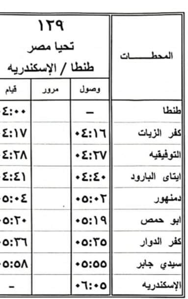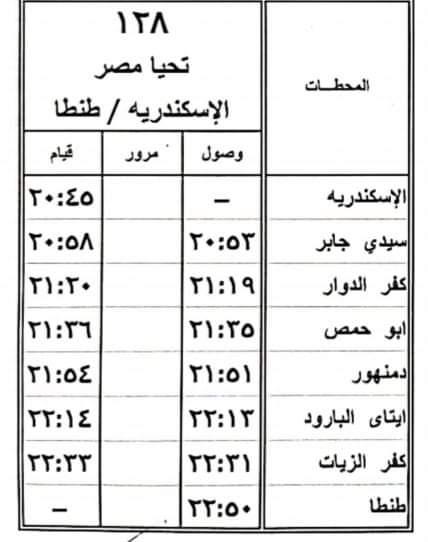 كما تقرر تشغيل خدمة جديدة وهى تشغيل قطار ( 128) كخدمة جديدة ( الإسكندرية / طنطا) بتركيب(10) عربات تحيا مصر على أن يقوم من محطة الإسكندرية الساعة 20:45 ويصل إلي محطة طنطا الساعة 22:50 طبقا للجدول المرفق واعتباراً من يوم الأحد الموافق 21 / 5 / 2023 وكذلك تشغيل قطار ( 129) إكسبريس (طنطا / الإسكندرية) خدمة جديدة بتركيب(10) عربات تحيا مصر على أن يقوم من محطة طنطا الساعة 04:00 ويصل إلى محطة الإسكندرية الساعة 06:05 طبقا للجدول المرفق .