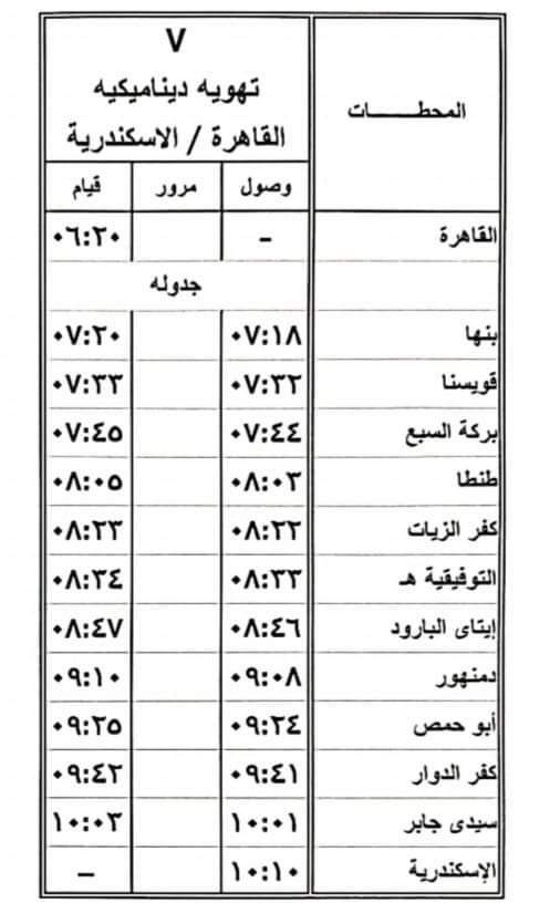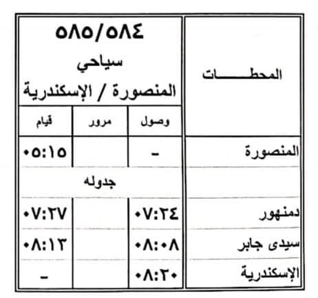 تعديل تركيب قطارات أرقام (892/889-894/899) بتركيب (10) عربات تحيا مصر طبقاً لجداولهم المرفقة كما قررت الهيئة إلغاء وقوف قطار (584/585) ثالثة مكيفة المنصورة / الإسكندرية /المنصورة بمحطتي أبو حمص و كفر الدوار طبقاً للجدول المرفق والخدمه البديلة قطار 7 القاهرة / الإسكندرية يتم وقفة بمحطة أبو حمص طبقاً للجدول المرفق واعتباراً من يوم السبت الموافق 20 / 5 / 2023