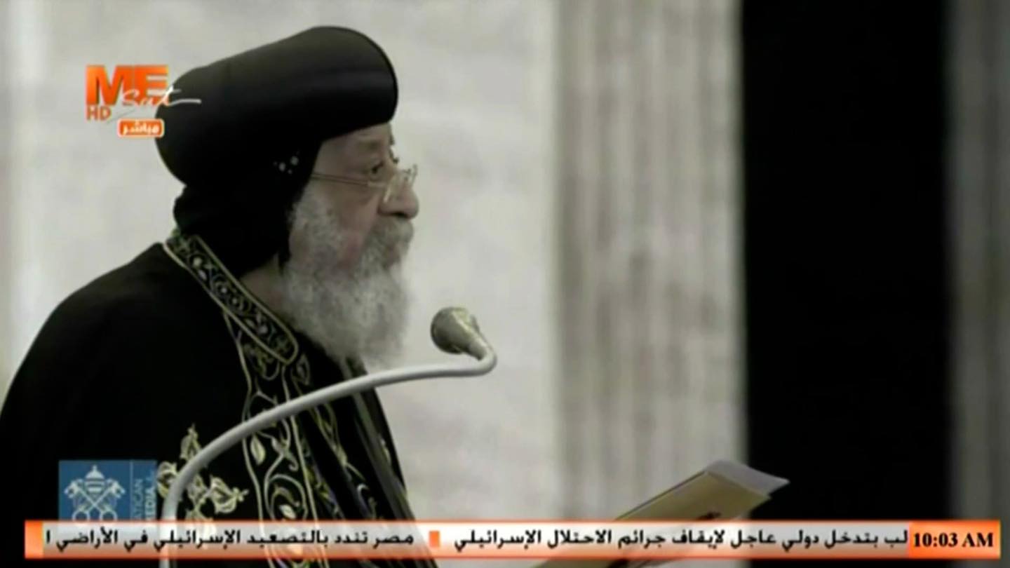 أود أن أنقل لكم تهنئتي وكل أعضاء المجمع المقدس وكل هيئات الكنيسة القبطية الأرثوذكسية بالعيد العاشر لاختياركم الالهي كبابا وأسقف لروما، وأُثَمِّن كل ما فعلتموه في هذه الفترة من خدمة لكل العالم في كل المجالات وأصلى أن يحفظكم المسيح في كامل الصحة ويمنحكم بركة العمر الطويل.