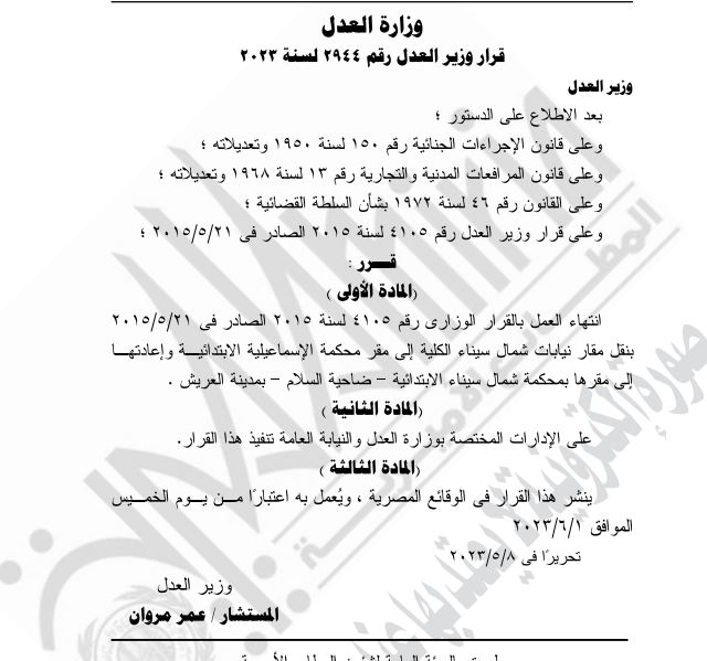 وصدر القرار رقم 2944 لسنة 2023، والذى تضمن انتهاء العمل بالقرار الوزاري رقم 4105 لسنة 2015 الصادر في 21 مايو 2015 بنقل مقار نيابات شمال سيناء الكلية إلى مقر محكمة الإسماعيلية الابتدائية وإعادتها إلى مقرها بمحكمة شمال سيناء الابتدائية - ضاحية السلام - بمدينة العريش.