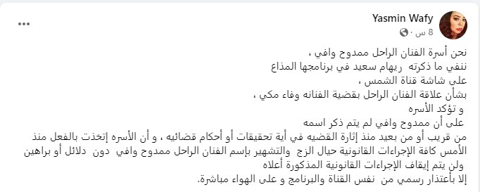 جاء في البيان ما يلي: نحن أسرة الفنان الراحل ممدوح وافي، ننفي ما ذكرته ريهام سعيد في برنامجها المذاع على شاشة قناة الشمس، بشأن علاقة الفنان الراحل بقضية الفنانه وفاء مكي، وتؤكد الأسرة أن ممدوح وافي لم يتم ذكر اسمه من قريب أو من بعيد منذ إثارة القضيه في أية تحقيقات أو أحكام قضائية، وأن الأسرة اتخذت بالفعل منذ الأمس كافة الإجراءات القانونية حيال الزج والتشهير باسم الفنان الراحل ممدوح وافي دون دلائل أو براهين، ولن يتم إيقاف الإجراءات القانونية المذكورة أعلاه إلا باعتذار رسمي من نفس القناة والبرنامج وعلى الهواء مباشرة.
