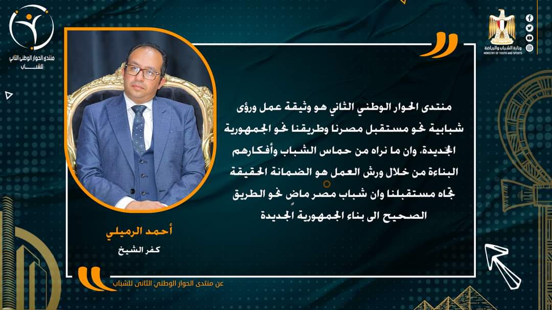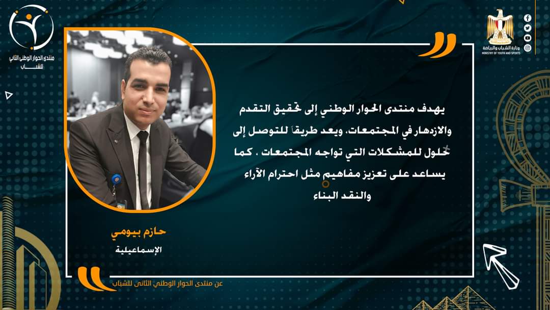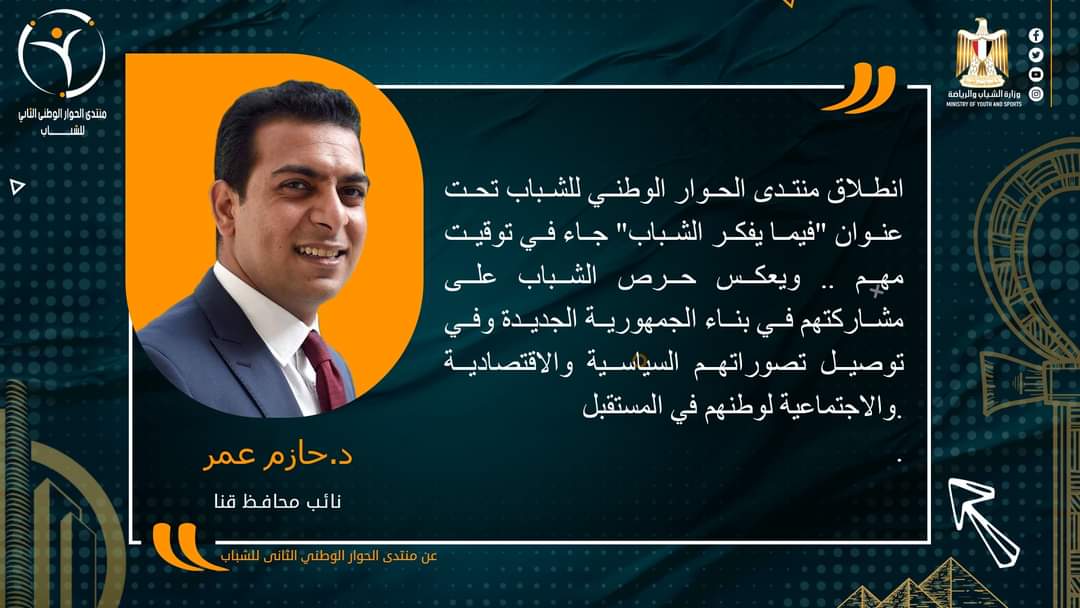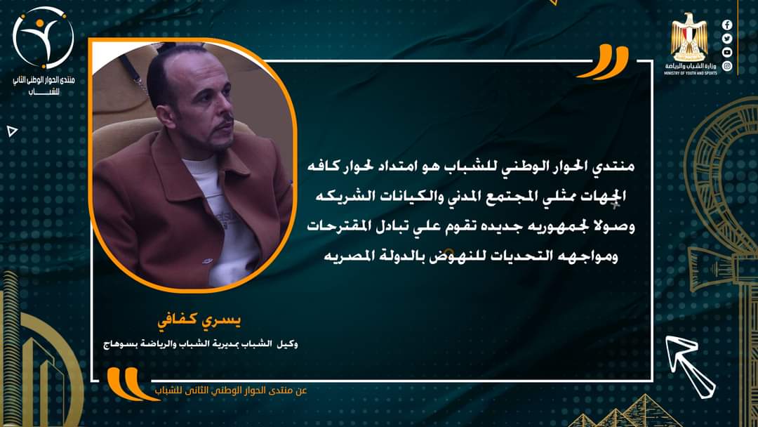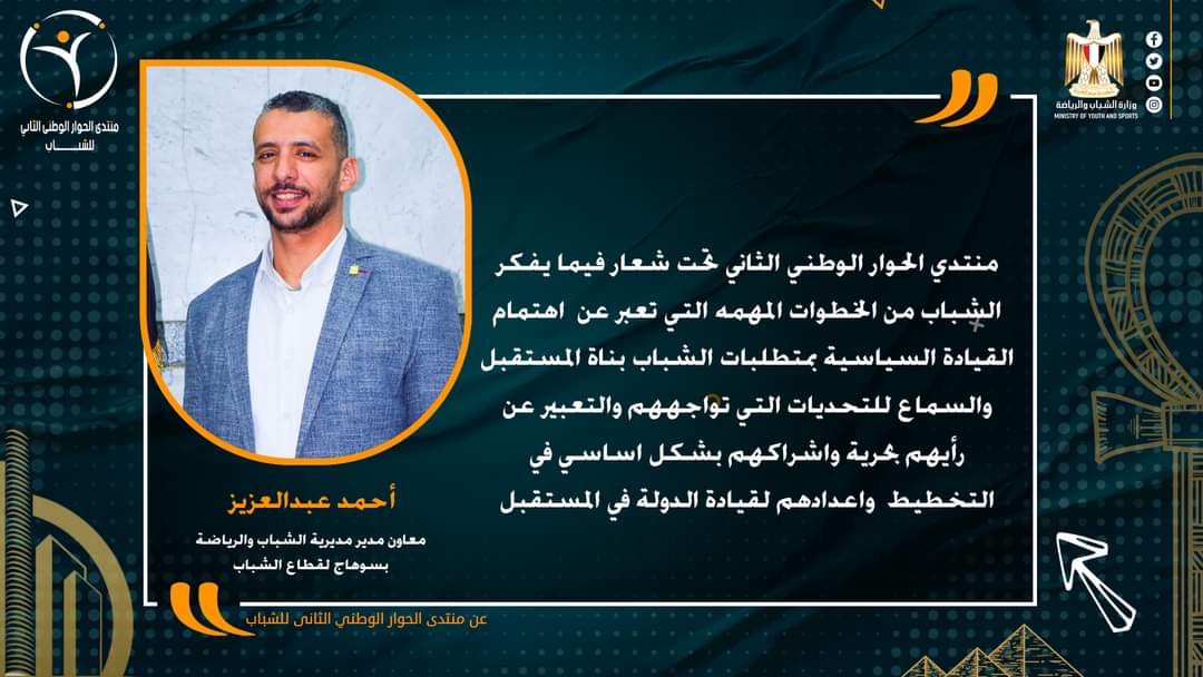 تواصل وزارة الشباب والرياضة ، من خلال الإدارة المركزية للتعليم المدني ، تسليط الضوء حول آراء المشاركين بــ «مُنتدي الحوار الوطني الثاني للشباب» في مرحلته الأولي ، الذي يحمل شعار « فيمَ يفكر الشباب ٠٠٠ حوار من الشباب للشباب »، وينفذ داخل 283 مركز شباب علي مستوي الجمهورية ، تحت رعاية الدكتور أشرف صبحي وزير الشباب والرياضة .