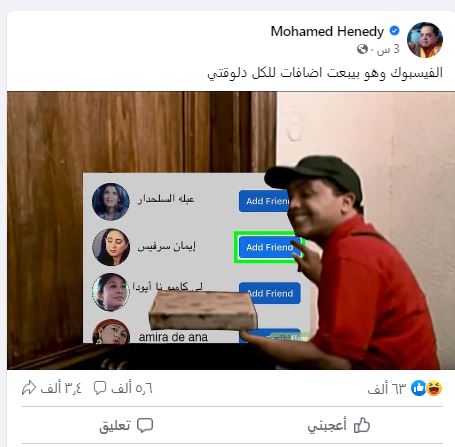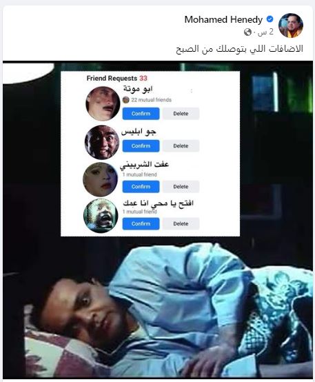 وكتب محمد هنيدي، أيضًا قائلًا :"الفيسبوك وهو بيبعت اضافات للكل دلوقتي".