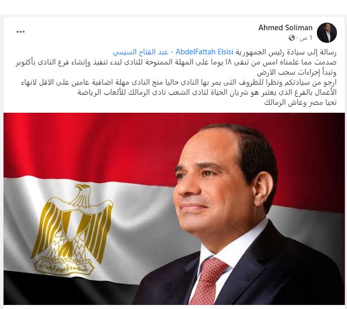 ونشر أحمد سليمان عبر حسابه الرسمي على موقع التواصل الاجتماعي "فيس بوك": "رسالة إلى سيادة رئيس الجمهورية عبد الفتاح السيسي.. صدمت مما علمناه امس من تبقى 18 يوما على المهلة الممنوحة للنادى لبدء تنفيذ وإنشاء فرع النادى بأكتوبر وتبدأ إجراءات سحب الارض ارجو من سيادتكم ونظرا للظروف التى يمر بها النادى حاليا منح النادى مهلة اضافية عامين على الاقل لانهاء الأعمال بالفرع الذى يعتبر هو شريان الحياة لنادى الشعب نادى الزمالك للألعاب الرياضة .. تحيا مصر وعاش الزمالك".