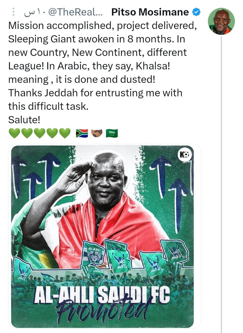و نشر موسيماني الجنوب إفريقي رسالة غريبة عبر حسابه الشخصي على موقع تويتر، حيث أكد خلال تغريدته أن أنجز مهتمه بنجاح، مستخدمًا كلمة "خلاص" باللغة العربية.