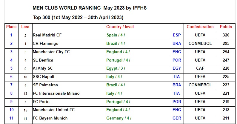 ويتواجد المارد الأحمر في المركز الخامس من تصنيف الأندية العالمية بـ 228 نقطة، متفوقاً بايرن ميونخ الألماني في المركز الـ 11، ونابولي الإيطالي في المركز السادس برصيد 225 نقطة، إلى جانب برشلونة الإسباني الذي احتل المركز الـ 24، وتصدر فريق ريال مدريد القائمة برصيد 320 نقطة.