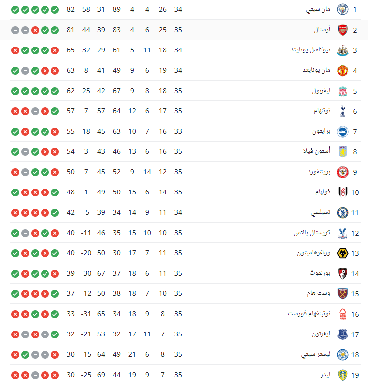 ويتربع فريق مانشستر سيتي صدارة جدول ترتيب الدوري الإنجليزي للموسم الجاري برصيد 89 نقطة ويليه فريق أرسنال في الوصافة برصيد 83 نقطة، وجاء جدول ترتيب الدوري الإنجليزي كالاتي: