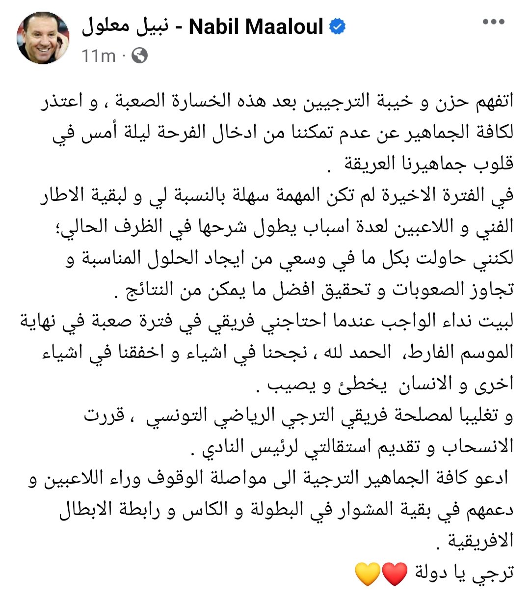 وأختتم: و تغليبا لمصلحة فريقي الترجي الرياضي التونسي ، قررت الانسحاب و تقديم استقالتي لرئيس النادي ، ادعو كافة الجماهير الترجية الى مواصلة الوقوف وراء اللاعبين و دعمهم في بقية المشوار في البطولة و الكاس و رابطة الابطال الافريقية .