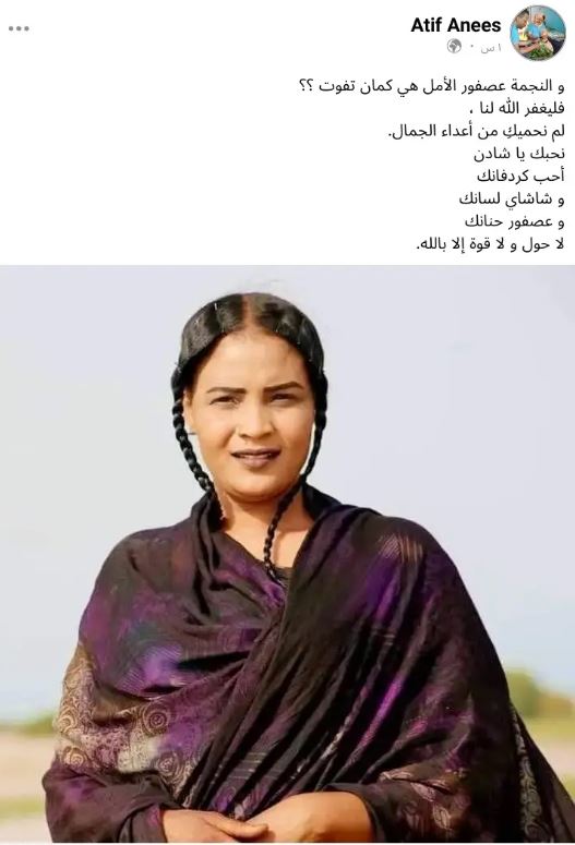وحرص الفنان عاطف أنيس، نعي الراحلة شادن حسين، عبر حسابه الشخصي على موقع التواصل الإجتماعي "فيسبوك"، قائلًا :"والنجمة عصفور الأمل هي كمان تفوت؟؟ فليغفر الله لنا، لم نحمِكِ من أعداء الجمال، نحبك يا شادن، أحب كردفانك، وشاشاي لسانك، وعصفور حنانك، لاحول ولا قوة إلا بالله".