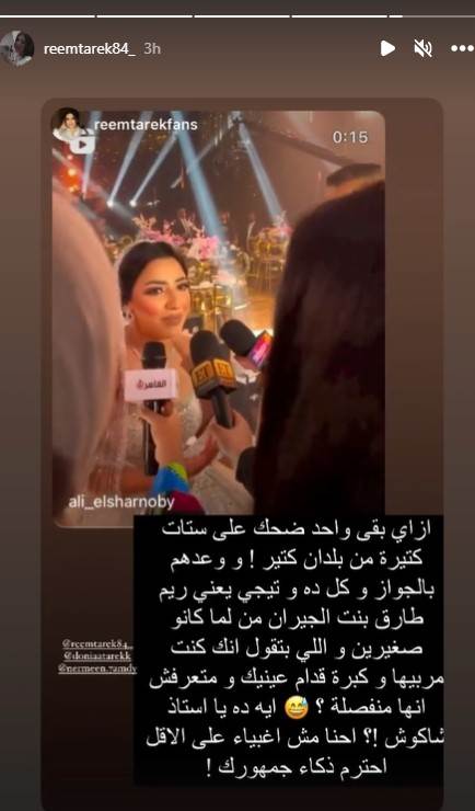 استخدمت ريم طارق، خاصية الاستوري، حيث اعاده نشر صورة قام بنشرها صفحة تدعى "فانز ريم طارق"، مكتوب خلالها :"ريم كانت متجوزة من سنتين وانفصلت بعد سنة واتجوزت حسن بعدها بسنه وشهور".