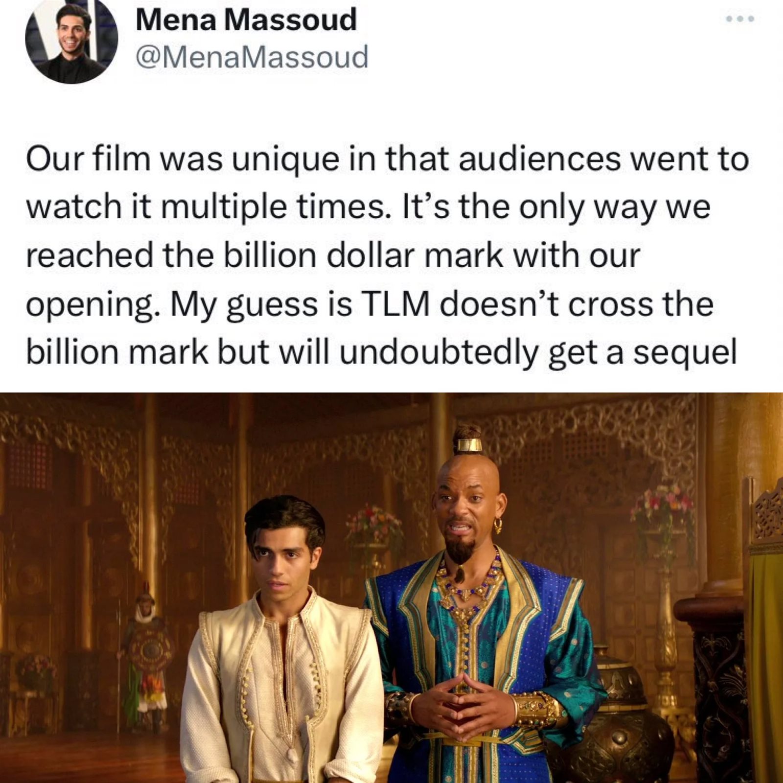 فكتب مينا مسعود خلال التغريدة:"لا أتوقع أن تتخطى إيردادات فيلم حورية البحر - The Little Mermaid" المليار دولار في شباك التذاكر، ومع ذلك سيحصل على تكملة، على عكس "علاء الدين" والذي أعجب الناس وتخطى المليار".