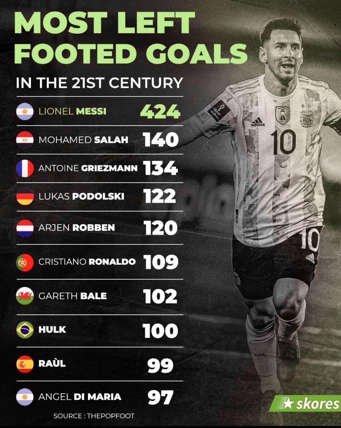 وجاءت قائمة الاكثر تسجيلًا بالقدم اليسرى في القرن الـ21 كالتالي، ميسي 424 هدفا، محمد صلاح 140 هدفاً، جريزمان 134 هدفا، لوكاس بودولسكي 122 هدفا، آريين روبن 120 هدفاً، كريستيانو رونالدو 109 هدفاً، جاريث بيل 102 هدفاً.