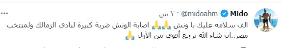 كتب ميدو عبر صفحته الرسمية على موقع التواصل الاجتماعي "تويتر": "ألف سلامة عليك يا ونش.. إصابة الونش ضربة كبيرة لنادي الزمالك ولمنتخب مصر، أن شاءالله ترجع أقوى من الأول".