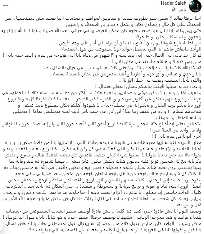لو كان حد قالي في الخيال حتي إني بعد سنة و ٣ شهور من وفاة بابا إني هخرجه من قبره و اقعد جنبه تاني ! مش بس كده لا و هنقله و ادفنه في مكان تاني ! قسمًا بالله كنت قولت ده إلحاد مثلًا ! ولا حتي كنت هستوعب إن في خيال بالشكل ده … بابا و جدي و عماتي و أزواجهم و أقاربنا و أهلنا مدفونين في مقابر بالسيدة نفيسة .. واللي لأجل النصيب وقعت في خطة الإزالة ..