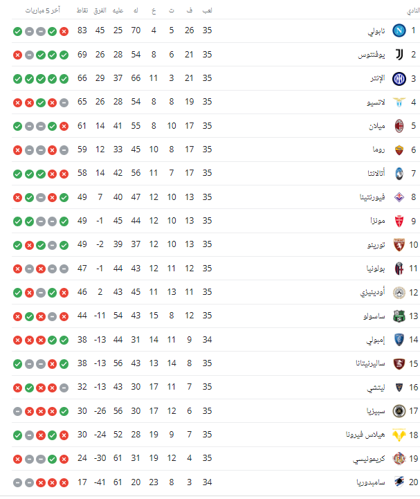وجاء جدول ترتيب الدوري الإيطالي كالاتي: