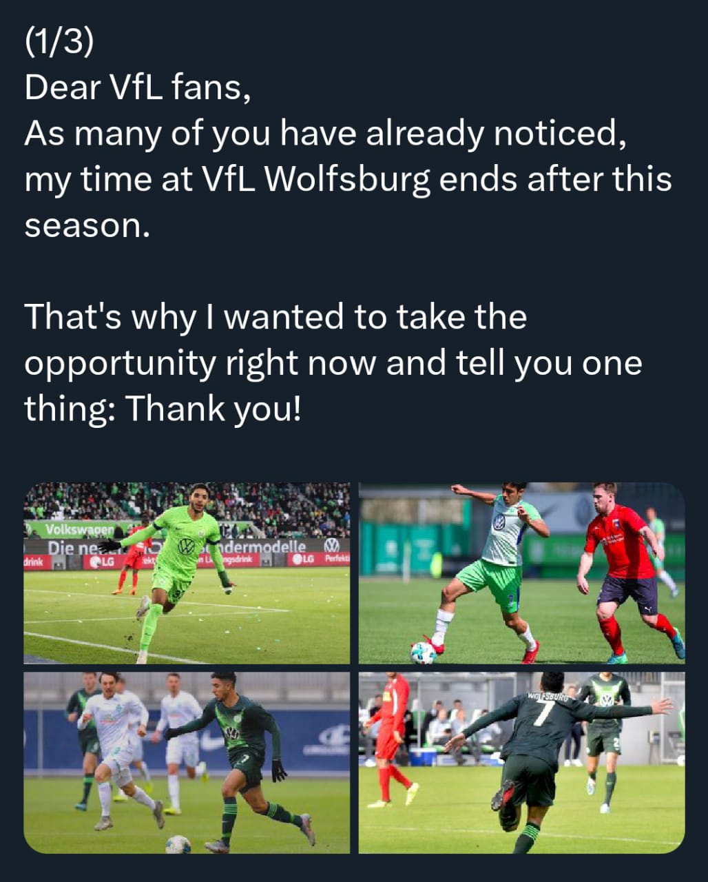 ودع الدولي المصري عمر مرموش، لاعب فريق فولفسبورج الإلماني النادي والجماهير برسالة مؤثرة قبل أسابيع من نهاية مشواره مع الفريق وبداية مرحلة جديدة .