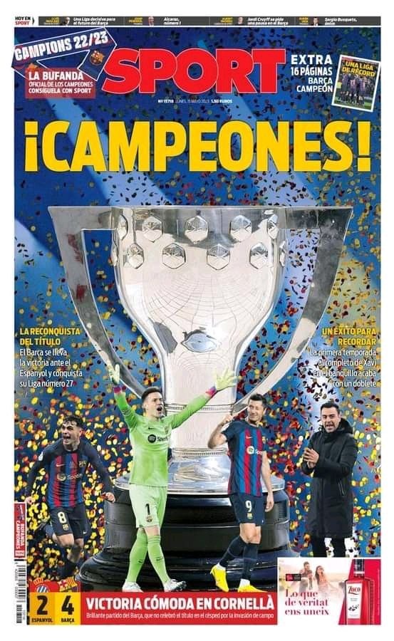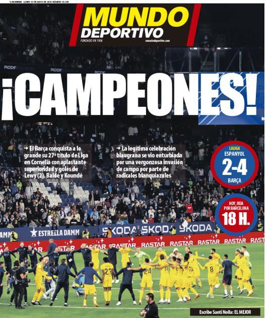 أهتمت صحف العالم بالحديث عن تتويج فريق برشلونة بلقب الدوري الإسباني للموسم الجاري، بعدما سحق نظيره إسبانيول بنتيجة 4-2 في المباراة التي جمعت بينهما أمس الأحد ، بملعب إستاد "كورنيلا إل برات" ضمن منافسات الجولة الـ 34 من بطولة الدوري الإسباني للموسم الجاري.