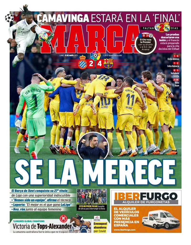 وأبرزت صحيفة "موندو ديبورتيفو" الإسبانية صورة للاعبي برشلونة أثناء الاحتفال بحصد لقب الدوري الإسباني داخل ملعب إسبانيول، تحت عنوان "الأبطال.. برشلونة يحقق لقب الليجا الـ27 فى كورنيا بفوز ساحق".