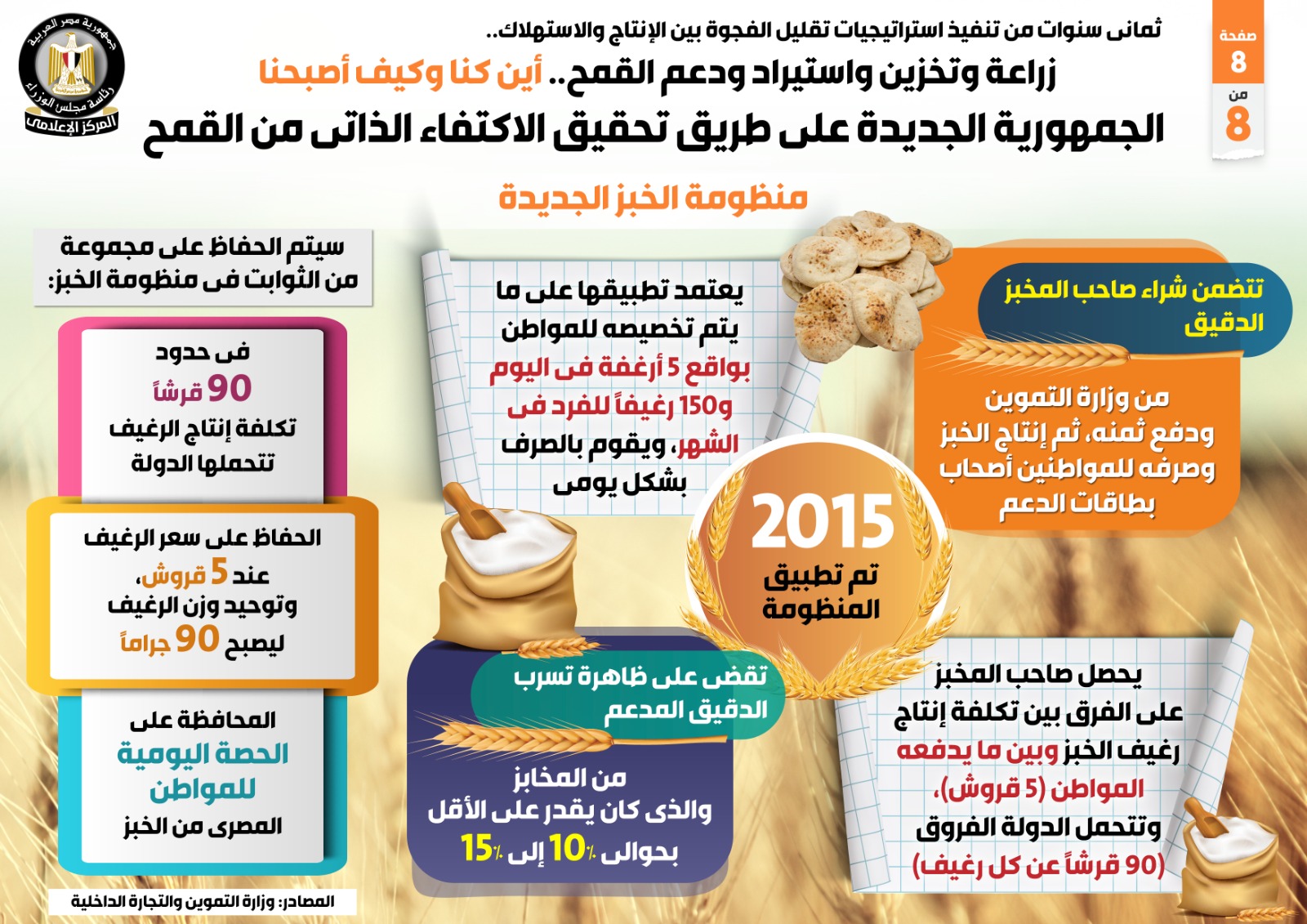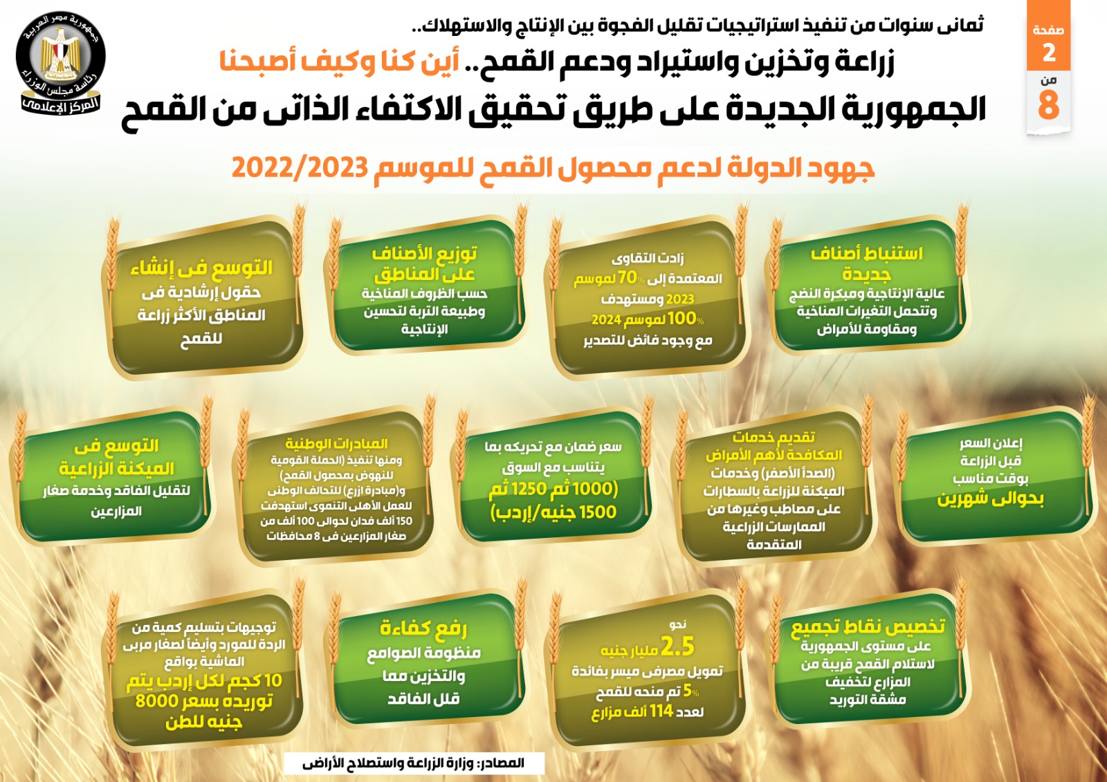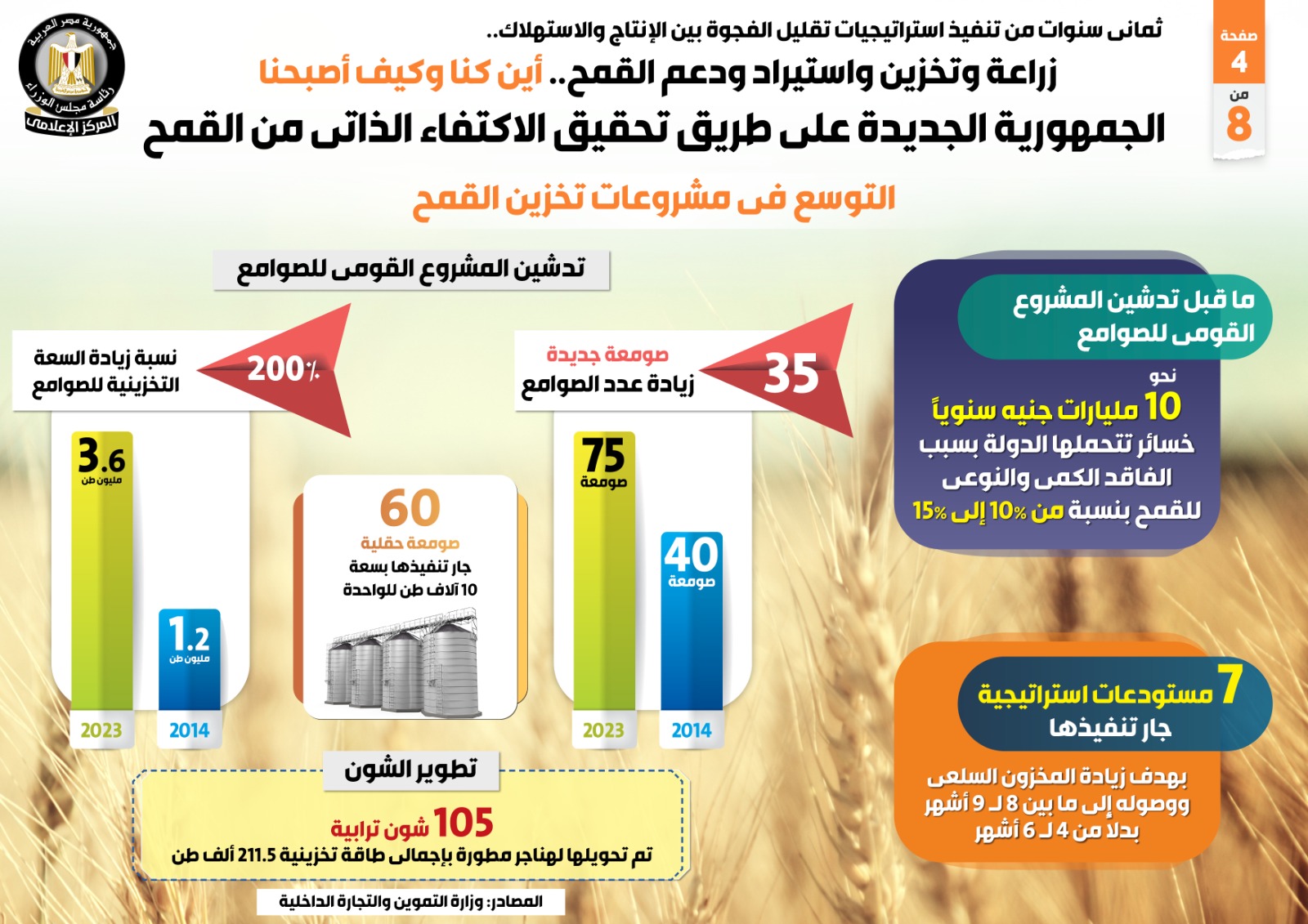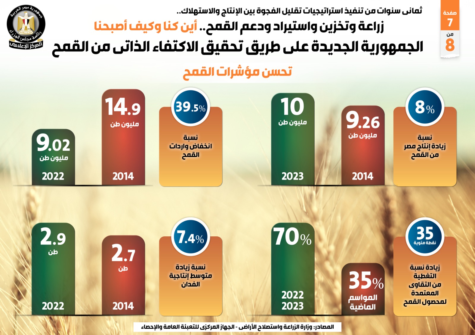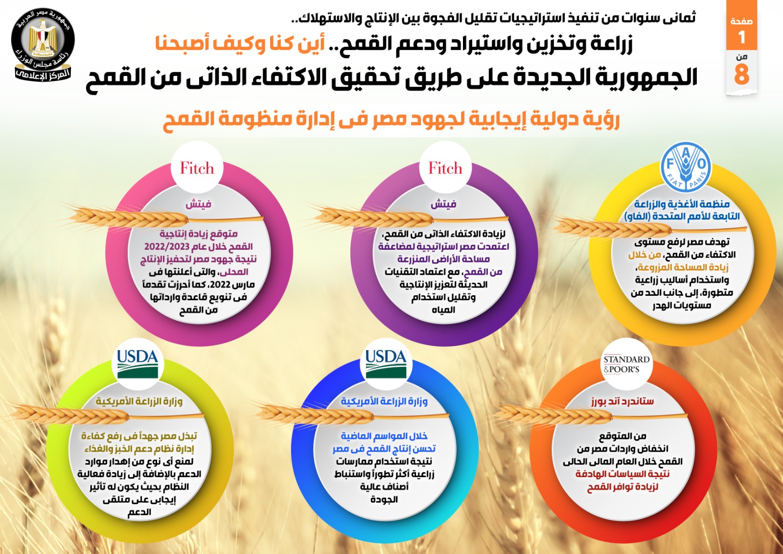 وفي هذا الصدد نشر المركز الإعلامي لمجلس الوزراء تقريراً ضمن سلسلة أين كنا وكيف أصبحنا، تضمن إنفوجرافات تسلط الضوء على جهود زراعة وتخزين واستيراد ودعم القمح، وجهود الجمهورية الجديدة على طريق تحقيق الاكتفاء الذاتي منه، بعد ثمان سنوات من تنفيذ استراتيجيات تقليل الفجوة بين الإنتاج والاستهلاك.