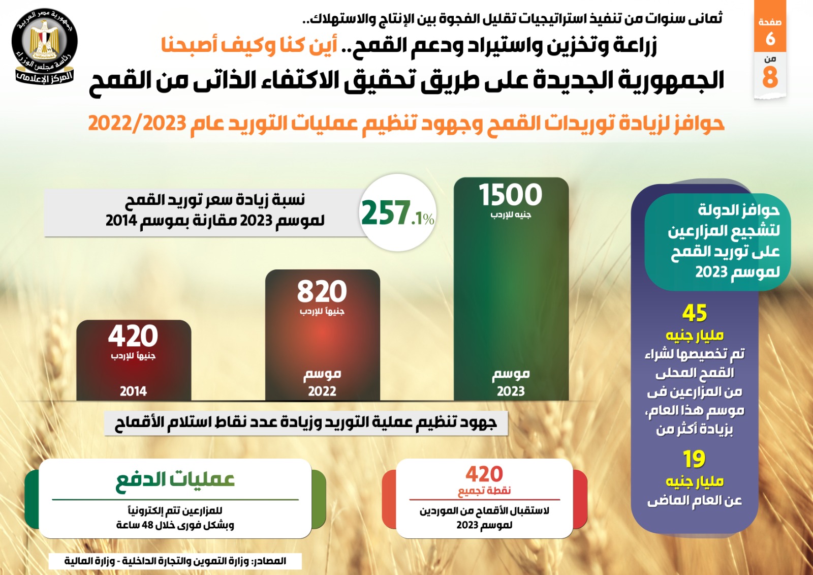 ورصد التقرير حوافز زيادة توريدات القمح وجهود تنظيم عمليات التوريد عام 2022/2023 حيث شملت حوافز الدولة لتشجيع المزارعين على توريد القمح لموسم 2023، تخصيص 45 مليار جنيه، لشراء القمح المحلي من المزارعين في موسم هذا العام بزيادة أكثر من 19 مليار جنيه عن العام الماضي، فيما تمت زيادة سعر توريد القمح 257.1% لموسم 2023، مقارنة بموسم 2014، ليبلغ 1500 جنيه للإردب في موسم 2023، و820 جنيهاً للإردب في موسم 2022، و420 جنيهاً للإردب في 2014.