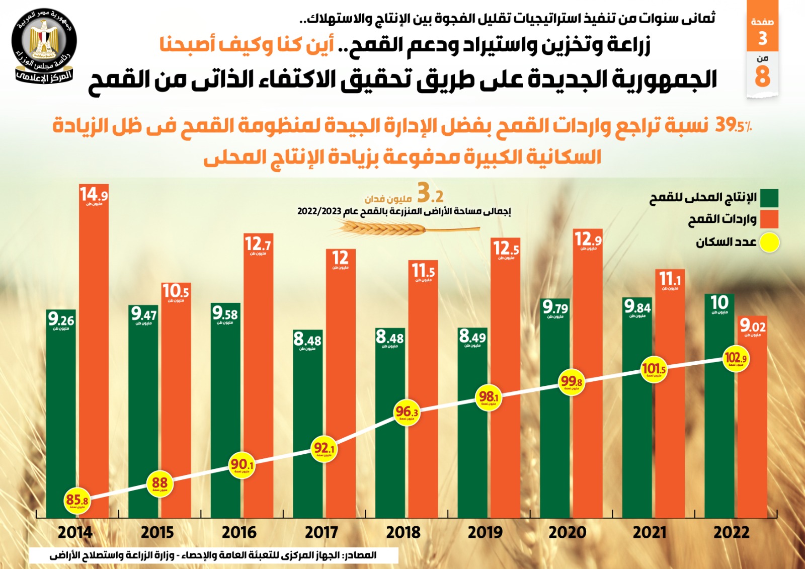 وأبرز التقرير تراجع واردات القمح بنسبة 39.5% بفضل الإدارة الجيدة لمنظومة القمح في ظل الزيادة السكانية الكبيرة مدفوعة بزيادة الإنتاج المحلي، مشيراً إلى أن حجم الإنتاج المحلي من القمح في عام 2022 بلغ 10 ملايين طن، في حين بلغت الواردات 9.02 مليون طن، مع بلوغ عدد السكان 102.9 مليون نسمة.