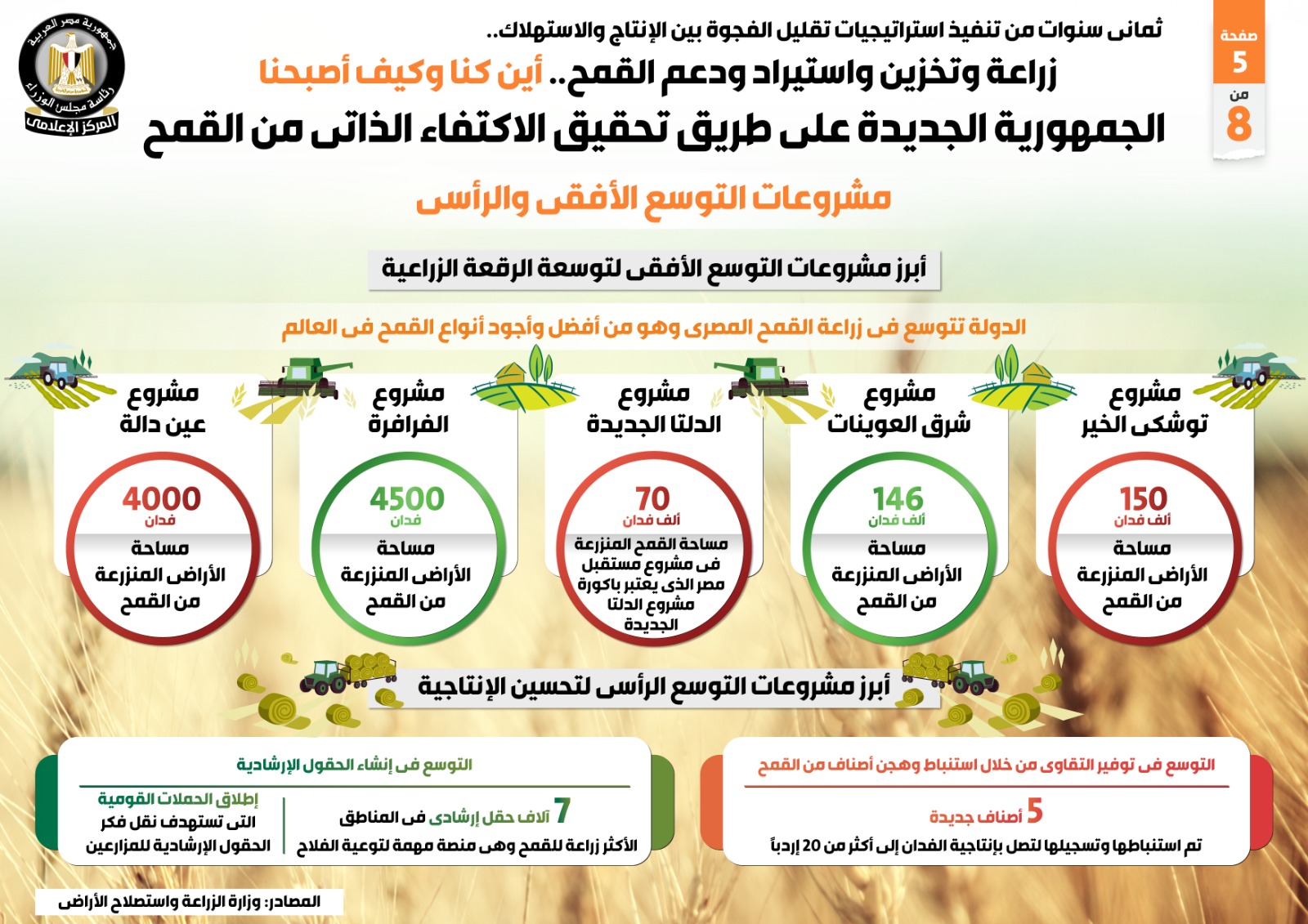 وأظهر التقرير أبرز مشروعات التوسع الرأسي لتحسين الإنتاجية، حيث تشمل التوسع في توفير التقاوي من خلال استنباط وهجن أصناف من القمح، حيث تم استنباط وتسجيل 5 أصناف جديدة لتصل بإنتاجية الفدان إلى أكثر من 20 إردباً، بجانب التوسع في إنشاء الحقول الإرشادية، لتشمل 7 آلاف حقل إرشادي في المناطق الأكثر زراعة للقمح وهي منصة مهمة لتوعية الفلاح، فضلاً عن إطلاق الحملات القومية التي تستهدف نقل فكر الحقول الإرشادية للمزارعين.