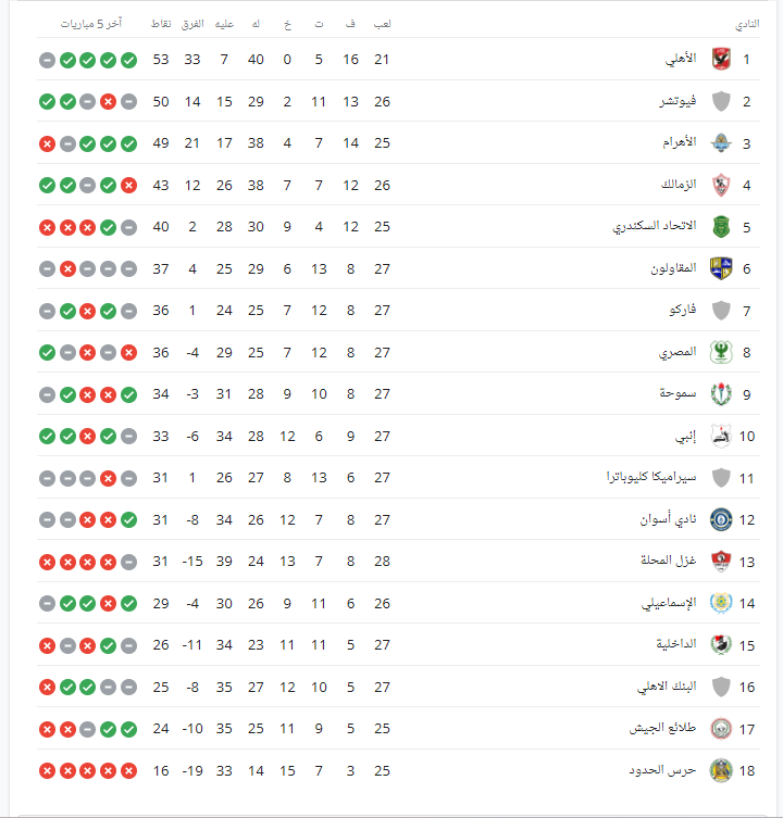 وجاء جدول ترتيب الدوري المصري كالاتي: