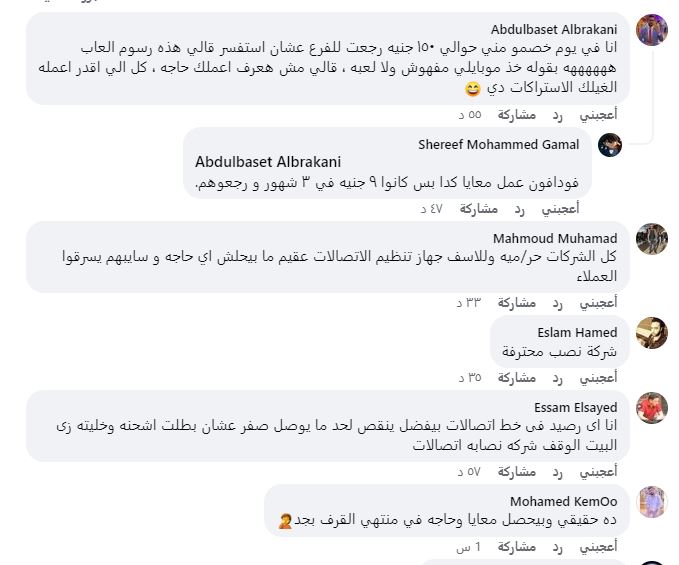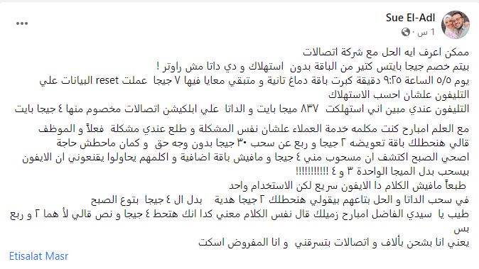 وقالت " طيب يا سيدي الفاضل امبارح زميلك قال نفس الكلام معني كدا انك هتحط 4 جيجا و نص قالي لأ هما 2 و ربع بس يعني انا بشحن بألاف و اتصالات بتسرقني و انا المفروض اسكت ".