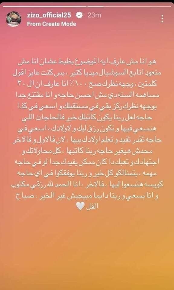 وكتب زيزو لاعب الزمالك، عبر استوري حسابه على موقع التواصل الاجتماعي "انستجرام": "معلش.. هو في إيه عشان أنا لسه صاحي، أنا عارف إن الـ 30 مساهمة السنة دي مش أحسن حاجة.. محدش هيغير حاجة ربنا كاتبها.. وأنا الحمد لله رزقي مكتوب.. وأنا بسعى.. وربنا مايجيبش غير الخير".