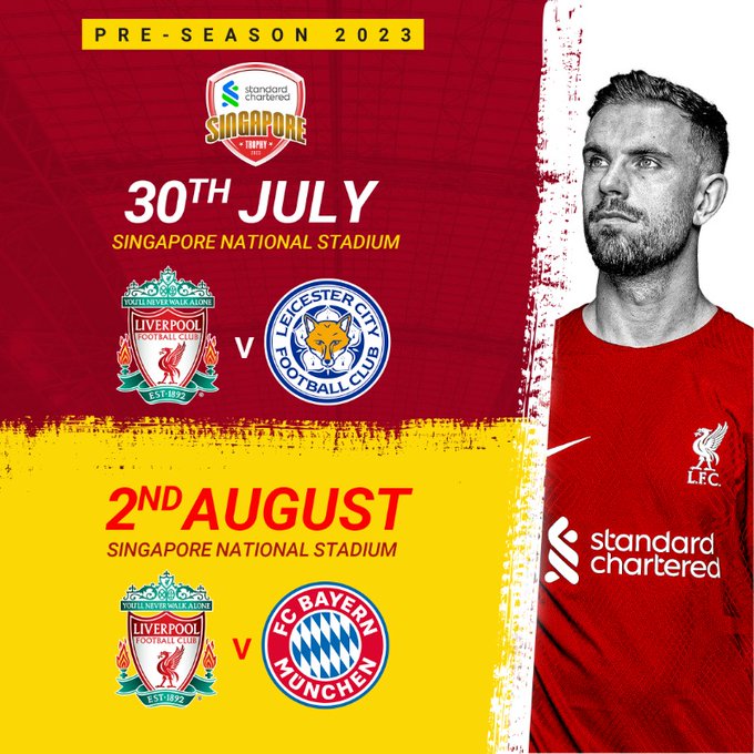 Liverpool f.c ..ويخوض فريق ليفربول الإنجليزي، مباراتين وديتين، الأولى أمام ليستر سيتي الإنجليزي، في 30 من يوليو المقبل، على الاستاد الوطني في سنغافورة.