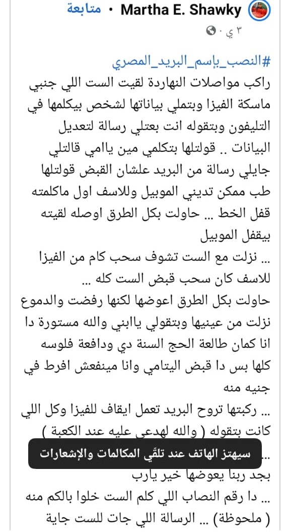 ونشرت أحدى رواد مواقع التواصل الاجتماعي منشور على موقع التواصل الاجتماعي "فيس بوك"، قائلة: راكب مواصلات النهاردة لقيت الست اللي جنبي ماسكة الفيزا وبتملي بياناتها لشخص بيكلمها في التليفون وبتقوله انت بعتلي رسالة لتعديل البيانات .. قولتلها بتكلمي مين ياامي قالتلي جايلي رسالة من البريد علشان القبض قولتلها طب ممكن تديني الموبيل وللاسف اول ماكلمته قفل الخط … حاولت بكل الطرق اوصله لقيته بيقفل الموبيل نزلت مع الست تشوف سحب كام من الفيزا للاسف كان سحب قبض الست كله.. حاولت بكل الطرق اعوضها لكنها رفضت والدموع نزلت من عينيها وبتقولي ياابني والله مستورة دا انا كمان طالعة الحج السنة دي ودافعة فلوسه كلها بس دا قبض اليتامي وانا مينفعش افرط في جنيه منه.. ركبتها تروح.. البريد تعمل إيقاف للفيزا وكل اللي كانت بتقوله (والله لهدعي عليه عند الكعبة).. الست من قرية شبرا بابل وشكلها بنت أصول بجد ربنا يعوضها خير يارب.. دا رقم النصاب اللي كلم الست خلوا بالكم منه".. (ملحوظة: الرسالة اللي جات للست جاية بإسم البريد المصري للاسف)