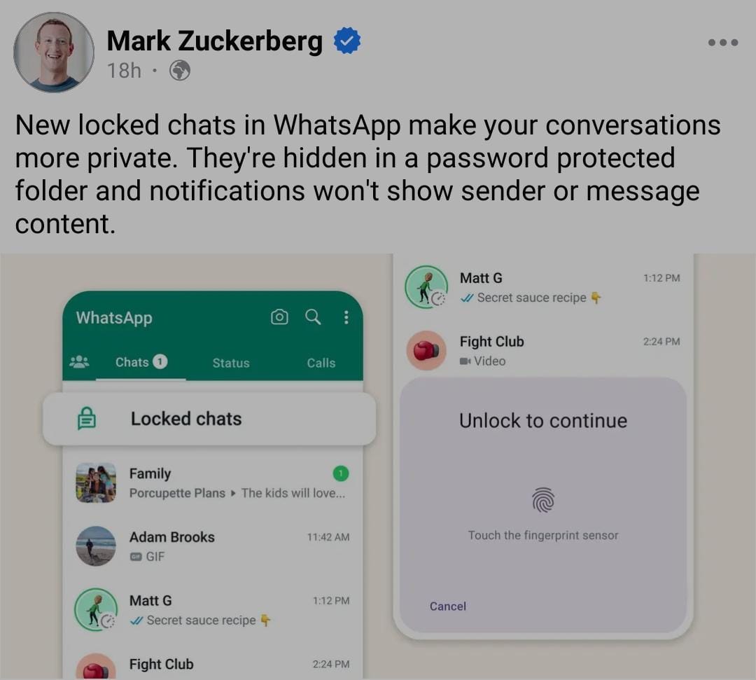 كتب مارك زوكربيرج عبر تغريدة له عبر تطبيق التواصل الاجتماعي "الفيسبوك":" الدردشات المقفلة الجديدة في واتساب تجعل محادثاتك أكثر خصوصية إنها مخفية في مجلد محمي بكلمة مرور ولن تعرض الإشعارات محتوى المرسل أو الرسالة."