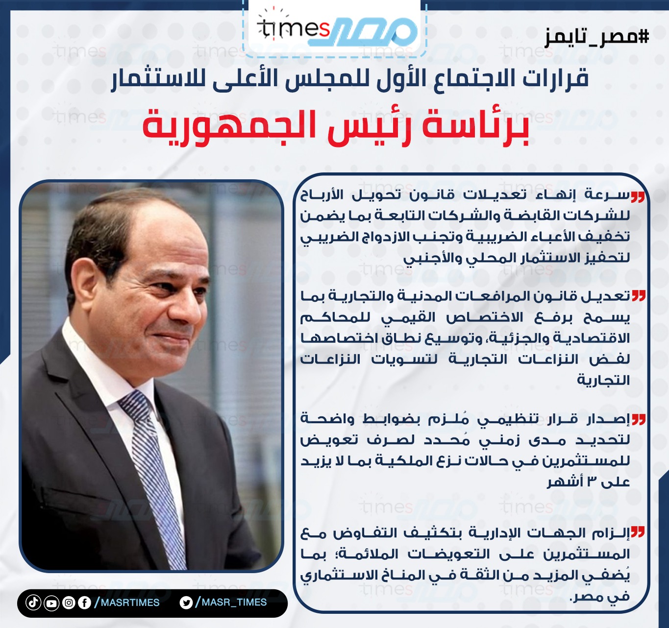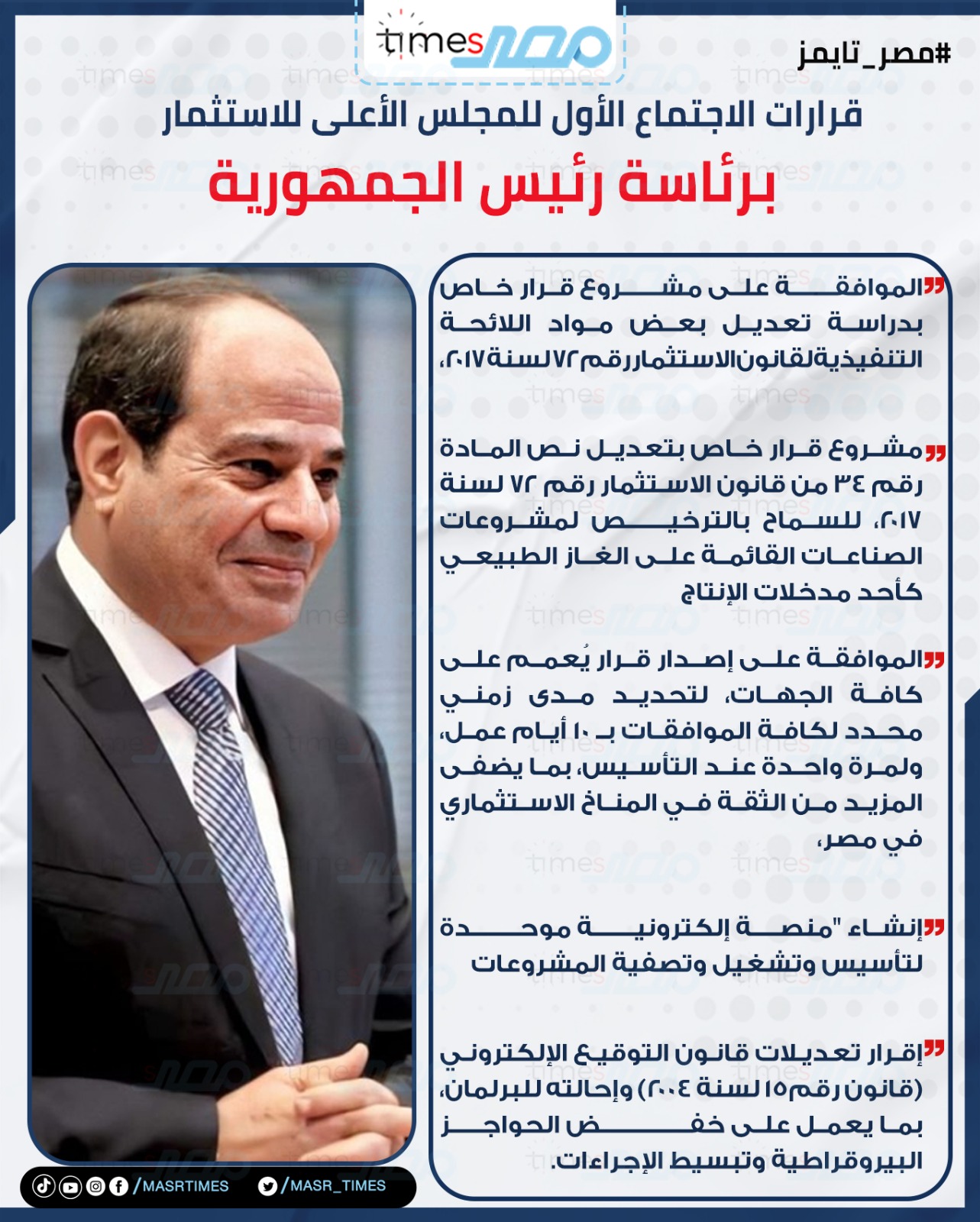 أصدر المجلس الإعلي للاستثمار برئاسة الرئيس عبد الفتاح السيسي، بتكليف مجلس الوزراء بدراسة نقل تبعية الأجهزة المُنظمة بقطاعات المرافق، بما يضمن استقلاليتها، بهدف تعزيز الفصل بين الملكية والإدارة في عدد من قطاعات الدولة.