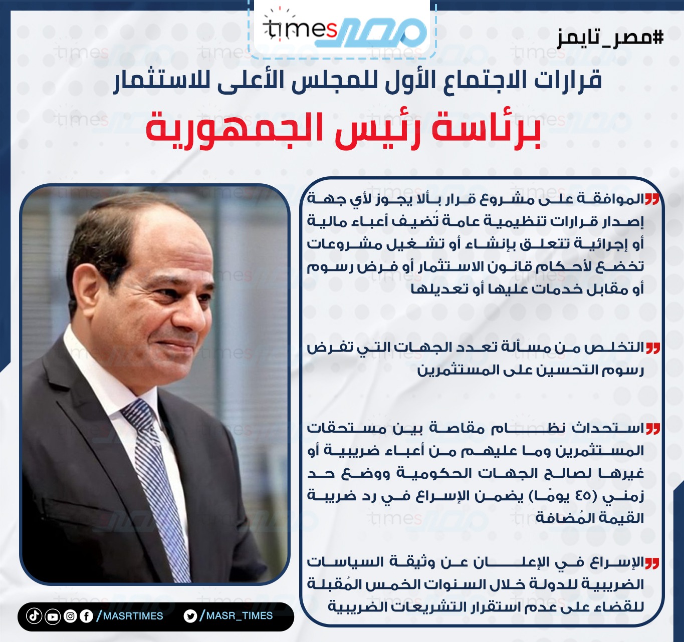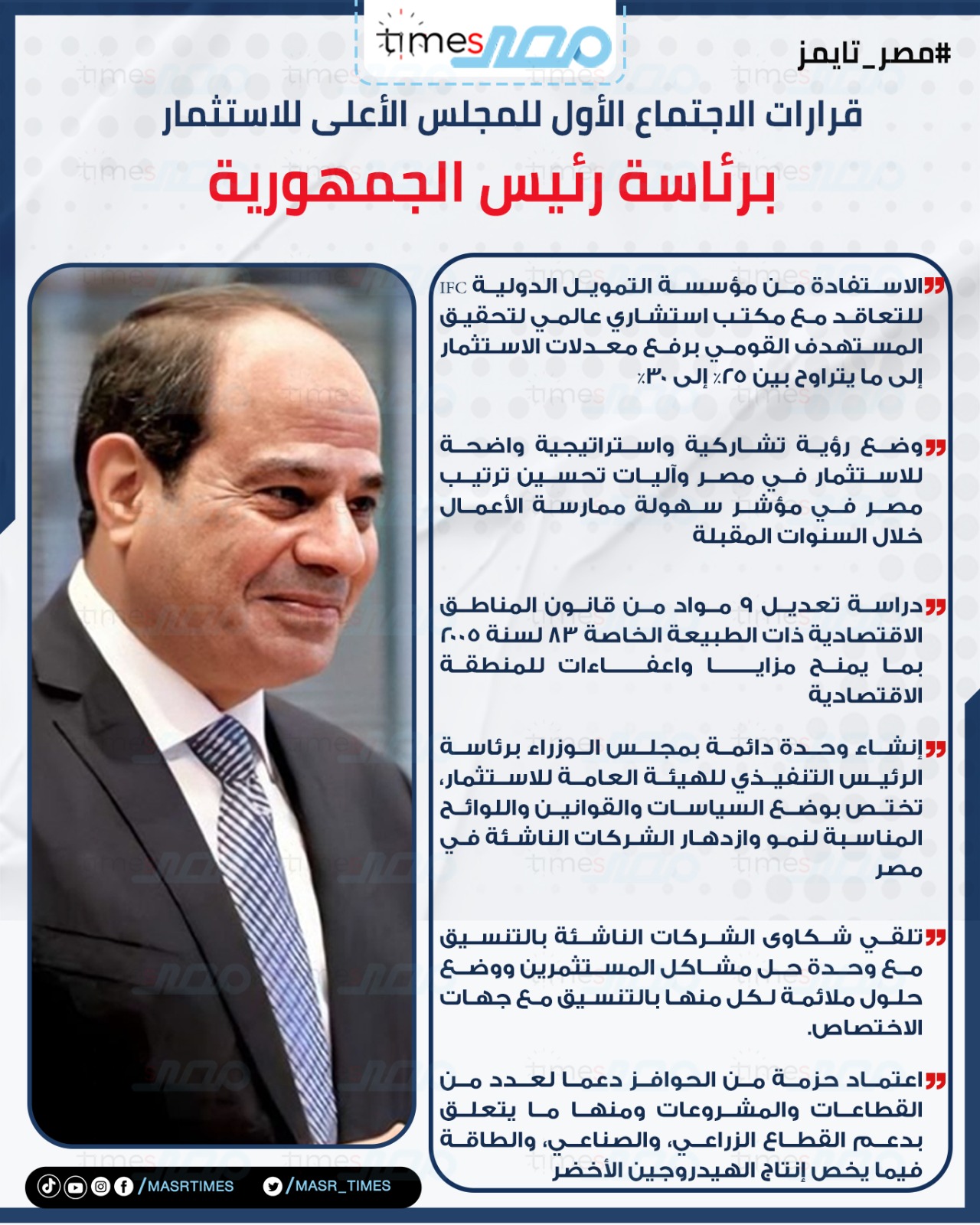 أصدر المجلس الإعلي للاستثمار برئاسة الرئيس عبد الفتاح السيسي ، مشروع قرار بالاستفادة من مؤسسة التمويل الدولية IFC، للتعاقد مع مكتب استشاري عالمي؛ لوضع رؤية تشاركية واستراتيجية واضحة للاستثمار في مصر، وآليات تحسين ترتيب مصر في مؤشر سهولة ممارسة الأعمال خلال السنوات المقبلة، لتحقيق المستهدف القومي برفع معدلات الاستثمار إلى ما يتراوح بين 25% إلى 30%.