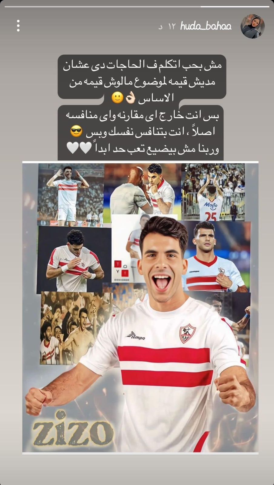 وقالت زوجة أحمد سيد زيزو عبر حسابها الشخصي بموقع التواصل الاجتماعي "إنستجرام": "مش بحب اتكلم في الحاجات دي عشان مديش قيمة لموضوع ملهوش قيمة من الاساس، بس انت خارج اي مقارنه وبتنافس نفسك وبس".