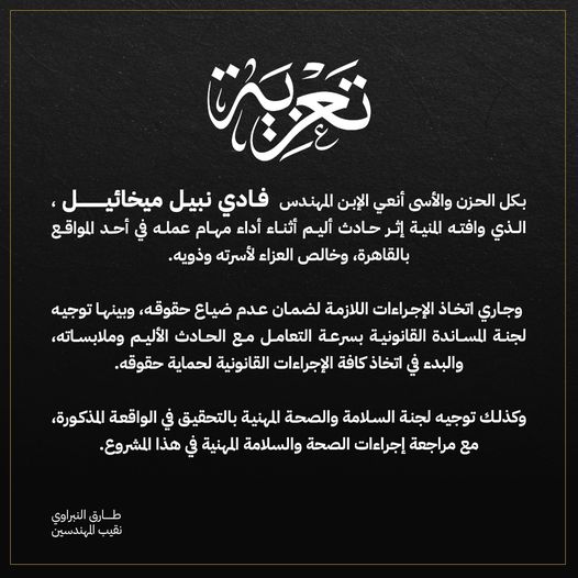 وقال نقيب المهندسين،" بكل الحزن والأسى أنعي الابن المهندس فادي نبيل ميخائيل، الذي وافته المنية إثر حادث أليم أثناء أداء مهام عمله في أحد المواقع بالقاهرة، وخالص العزاء لأسرته وذويه، وجاري اتخاذ الإجراءات اللازمة لضمان عدم ضياع حقوقه، وبينها توجيه لجنة المساندة القانونية بسرعة التعامل مع الحادث الأليم وملابساته، والبدء في اتخاذ كافة الإجراءات القانونية لحماية حقوقه، وكذلك توجيه لجنة السلامة والصحة المهنية بالتحقيق في الواقعة المذكورة، مع مراجعة إجراءات الصحة والسلامة المهنية في هذا المشروع".