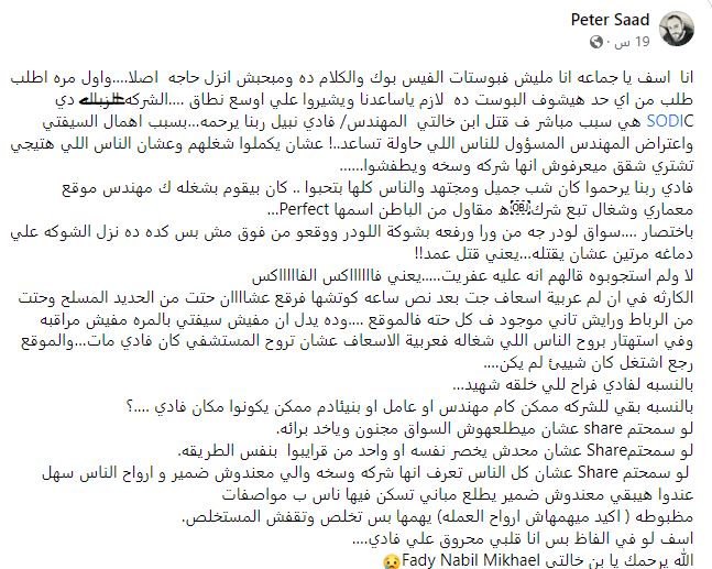 وقال أحد أقارب المهندس فادي نبيل ،" انا اسف يا جماعه انا مليش فبوستات الفيس بوك والكلام ده ومبحبش انزل حاجه اصلا….واول مره اطلب طلب من اي حد هيشوف البوست ده لازم ياساعدنا ويشيروا علي اوسع نطاق ….الشركه الزباله دي SODIC هي سبب مباشر ف قتل ابن خالتي المهندس/ فادي نبيل ربنا يرحمه…بسبب اهمال السيفتي واعتراض المهندس المسؤول للناس اللي حاولة تساعد..! عشان يكملوا شغلهم وعشان الناس اللي هتيجي تشتري شقق ميعرفوش انها شركه وسخه ويطفشوا……فادي ربنا يرحموا كان شب جميل ومجتهد والناس كلها بتحبوا .. كان بيقوم بشغله ك مهندس موقع معماري وشغال تبع شركه مقاول من الباطن اسمها Perfect…
