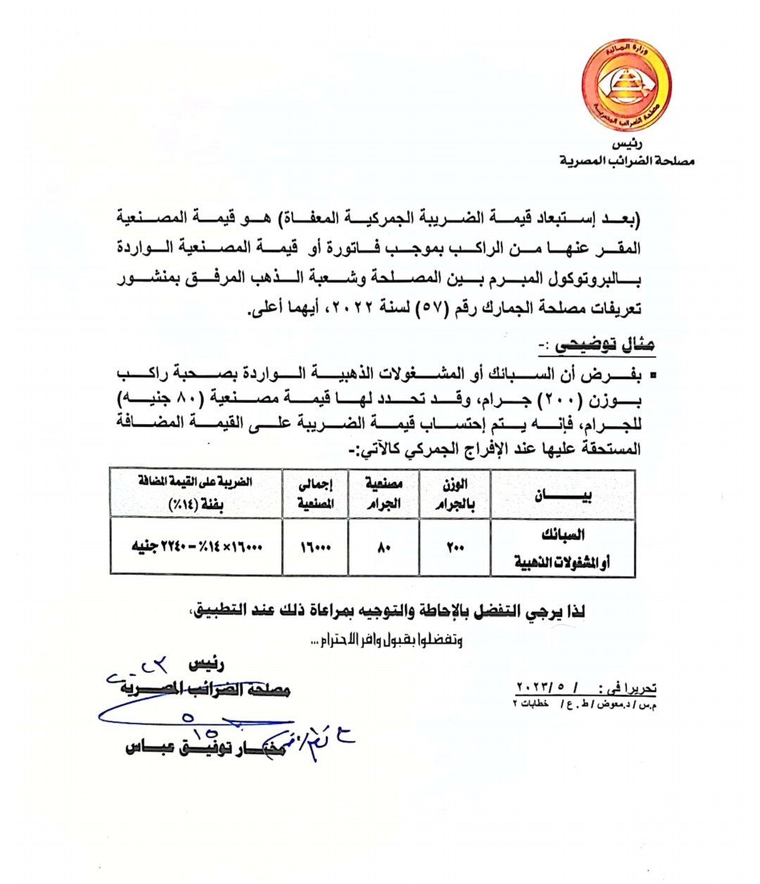 أصدرت مصلحة الضرائب المصرية خطابا موجها لمصلحة الجمارك لتحديد قيمة ضريبة القيمة المضافة المقرر تحصيلها علي واردات الذهب الواردة بصحبة الوافدين سواء من المصريين أو غيرهم من الجنسيات الزائرة لجمهورية مصر العربية و الصادر بشأنها قرار رئيس الوزراء رقم 1801 لسنة 2023 باعفاءها من الرسوم الجمركية و تحصيل ضريبة القيمة المضافة عيلها فقط دون غيرها من الرسوم.