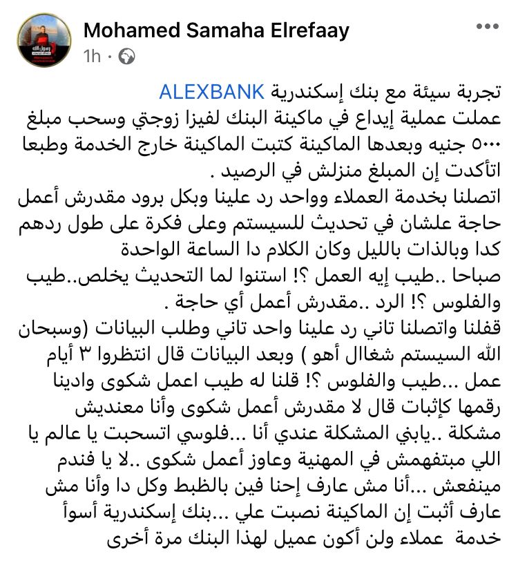 وقال صاحب المشكلة ، تجربة سيئة مع بنك إسكندرية ALEXBANK عملت عملية إيداع في ماكينة البنك لفيزا زوجتي وسحب مبلغ 5000 جنيه وبعدها الماكينة كتبت الماكينة خارج الخدمة وطبعا اتأكدت إن المبلغ منزلش في الرصيد .