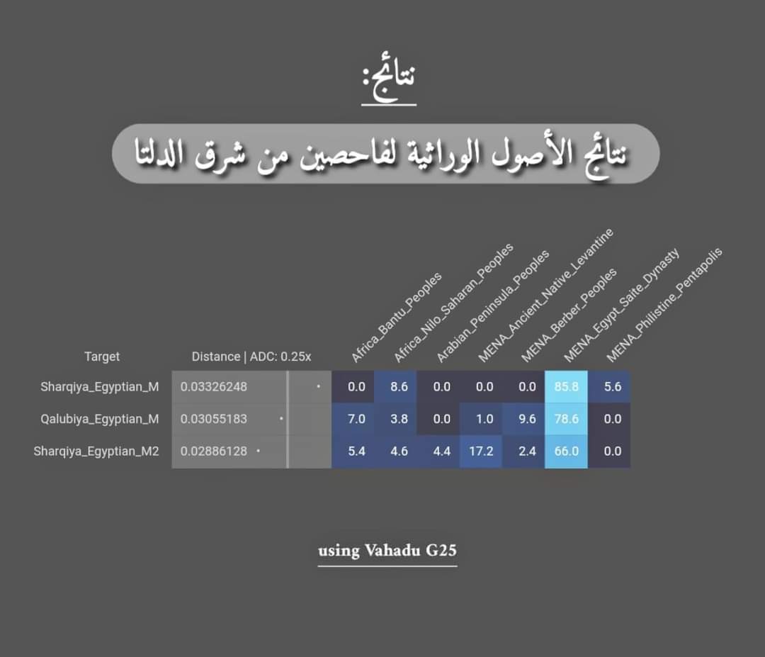ظهرت نتائجهم من حاسبة G25وأكد الباحث في علم الجينات أنه أحد مؤسسي مبادرة "إيجي أورجين" التي أشرفت على العديد من التحليلات الجينيه، مضيفًا أن غالبية المصريين بالكامل لديهم 80% أصول مصرية مستمدة من المومياوات، والبقية أصول من جنوب الصحراء ودول الجوار.