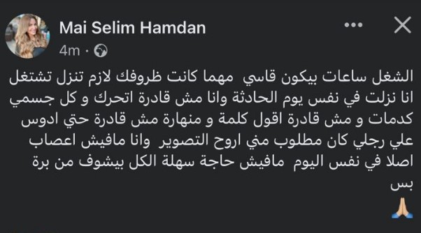 وكتبت مي سليم عبر حسابها الشخصي بموقع التواصل الإجتماعي " الفيسبوك" قائلا:" الشغل ساعات بيكون قاسي مهما كانت ظروفك، لازم تنزل تشتغل أنا نزلت في نفس يوم الحادثة، وأنا مش قادرة اتحرك وكل جسمي كدمات".